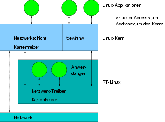 In Real-Time Linux werden die Realzeit-Prozesse von einem (von Linux unabhängigen) erweiterbaren Mikro-Kern verwaltet. Der eigentliche Linux-Betriebssystemkern ist aus der Sicht dieses Mikro-Kerns ebenfalls nur ein Realzeit-Prozess mit niedrigster Priorität. Realzeit-Prozesse und normale Linux-Prozesse können über einen gemeinsamen Speicher miteinander kommunizieren.